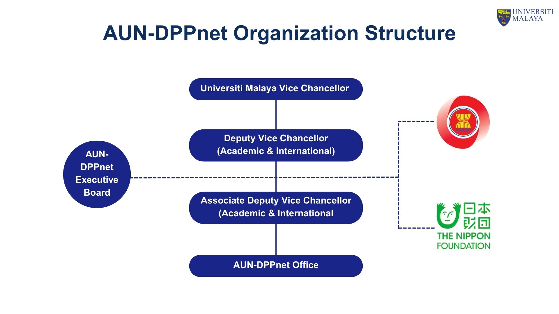 Universiti Malaya serves as the host institution for AUN-DPPnet. The Secretariat operates under the portfolio of the Deputy Vice-Chancellor (Academic & International) office. All initiatives and activities carried out by AUN-DPPnet are reported to its principal donor, The Nippon Foundation (Japan), as well as to the AUN-Dppnet's Executive Board Members, who serve as advisors and participate in decision-making processes.